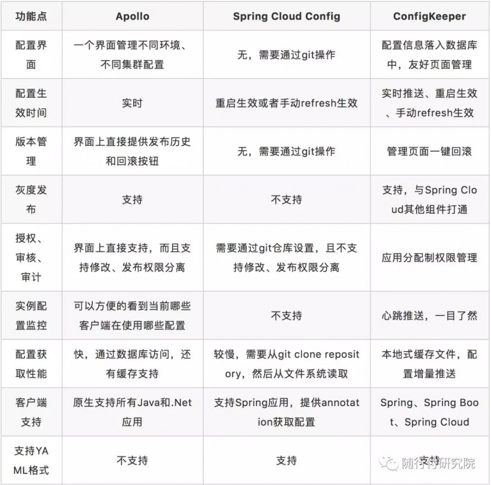 市面上已经有几款比较成型的配置中心,大家耳熟能详的携程Apollo和百度Disconf,而我们的配置中心底层是基于Spring Cloud Config模块进行扩展的,首先来看看Apollo、Spring Cloud Config、ConfigKeeper的功能差异: