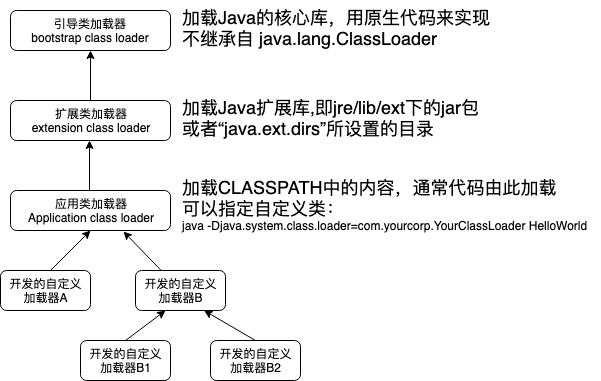 除了引导类加载器外所有类都有一个父加载器,他们的树形关系如下图所示:
