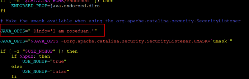 然后修改 Tomcat 下面的 bin/catalina.sh 文件,添加一个 JAVA_OPTS 属性,指定 info 的值:
