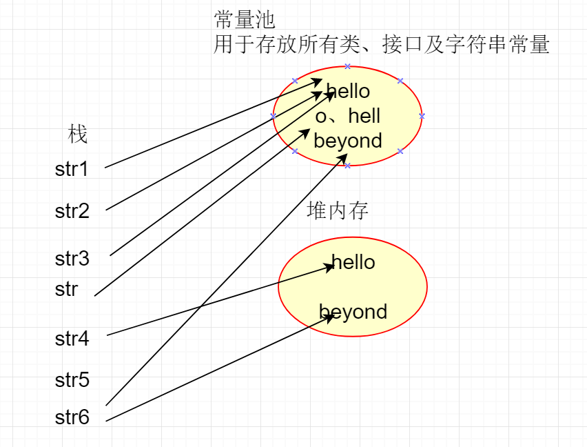 通过 方式二 而创建String对象, 首先会先查看常量池中是否存在这个字符串常量 ,如果存在,则直接在对内存中new出新对象;否则,会先在常量池生成这个字符串常量,再在堆中生成新对象(如图中str6)。