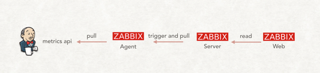 所以,我们需要在 Zabbix agent 所在机器放一个获取 Jenkins 指标数据的脚本。再配置 Zabbix server 定时从该 agent 获取数据,最后配置触发器(trigger)实现告警。
