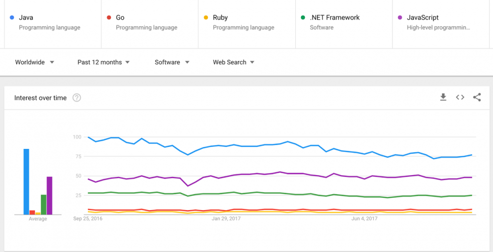 Java 已经通过在包括 Hadoop 生态系统、Cassandra 数据存储和云基础设施技术栈中的使用而证明了自己是一种流行的分布式系统语言。此外,它仍然是一种非常流行的语言。可以看看在谷歌趋势的统计数据中,Java 仍然占据主导地位: