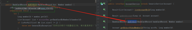 阿里巴巴规范要求,如果当前方法覆盖超类的方法,必须写上override注解。因为我们如果不小心拼写错误,或者方法签名对不上覆盖的方法,编译器就会发出错误地提示。我们忘记写override注解,但这并不影响使用。比如,我们需要重写接口AccountService的auditAcct方法签名,但并没有加上override注解,编译器就会错误的提示,但不是报错。