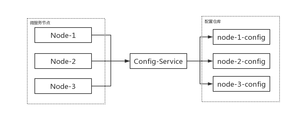 上图是Spring Cloud Config的基本结构。左侧是一系列的微服务节点,右侧是他们对应的配置文件。例如Node-1服务对应的是 node-1-config.yml 文件,在单一的应用中本来 node-1-config.yml 文件应该是放置在Node-1工程的classpath下的,现在的区别是将他们分开,将配置文件统一放置到一个仓库中,然后用Config-Service来管理。