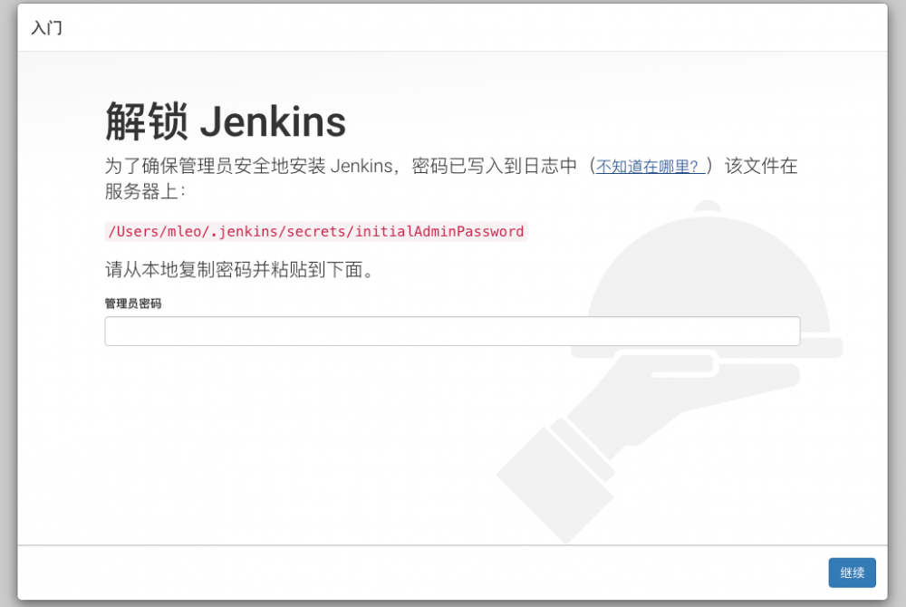 通过 cat /Users/mleo/.jenkins/secrets/initialAdminPassword 查看密码