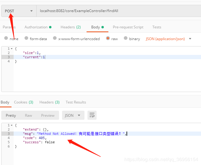 我们用postman通过 post 方式请求一个 get 的方法,可以看到返回了我们自定义的json格式,并且告诉我们这是因为接口类型所导致的错误,这样我们很快就能定位到错误进行解决。