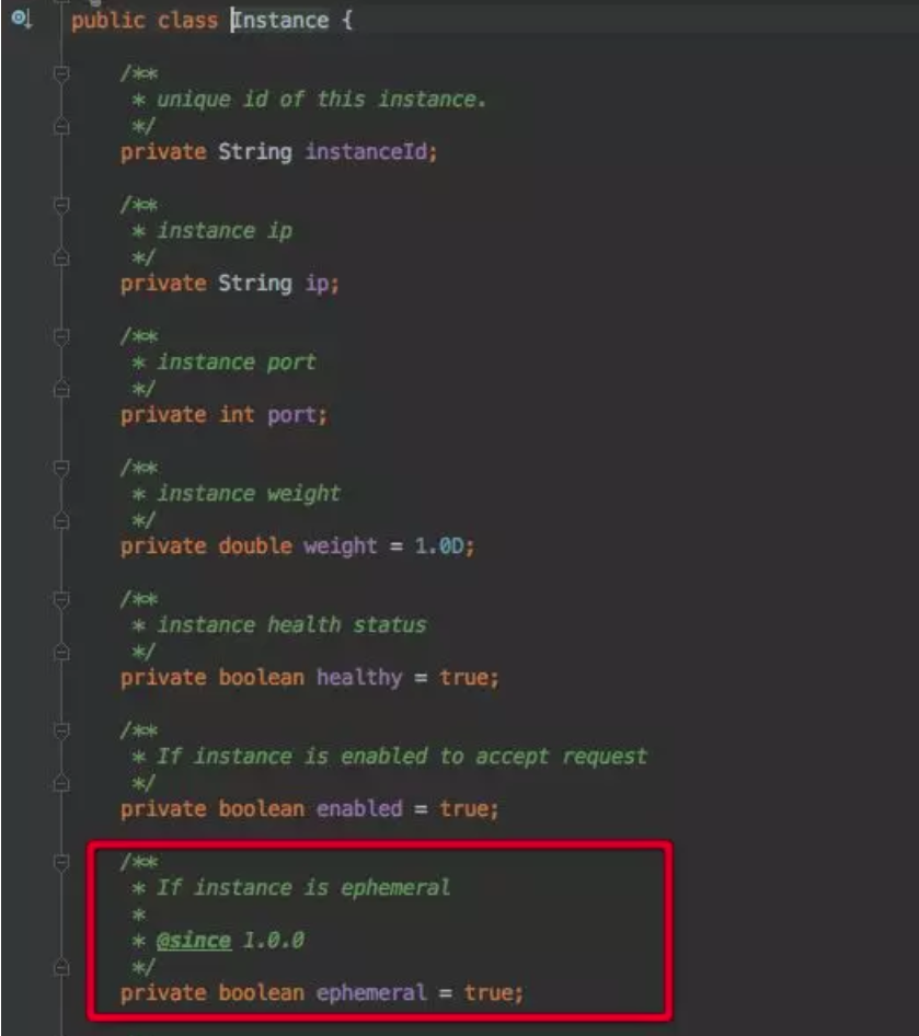Nacos 1.0.0 版本在 instance 级别上增加了一个 ephemeral 字段,该字段表示注册的实例是临时实例还是持久化实例。如果是临时实例,则不会在 Nacos 服务端持久化存储,需要通过上报心跳的方式进行保活,如果一段时间内没有上报心跳,则会被 Nacos 服务端摘除。在被摘除后如果又开始上报心跳,则会重新将这个实例注册。持久化实例则会持久化到 Nacos 服务端,此时即使注册实例的客户端进程不在,这个实例也不会从服务端删除,只会将健康状态设为不健康。