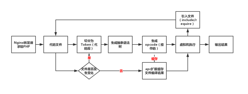 Nginx 转发请求给 PHP 主进程 PHP 解释器会先将代码切分为 Token PHP 虚拟机执行操作码 2-6 步骤 可以看到每次请求过来,都会对文件做一次编译和缓存,那么这样会非常影响效率,为了保证 PHP 的灵活性,同时提升效率,我们需要对编译好的操作码进行缓存。这就是 apc 扩展做的事情: