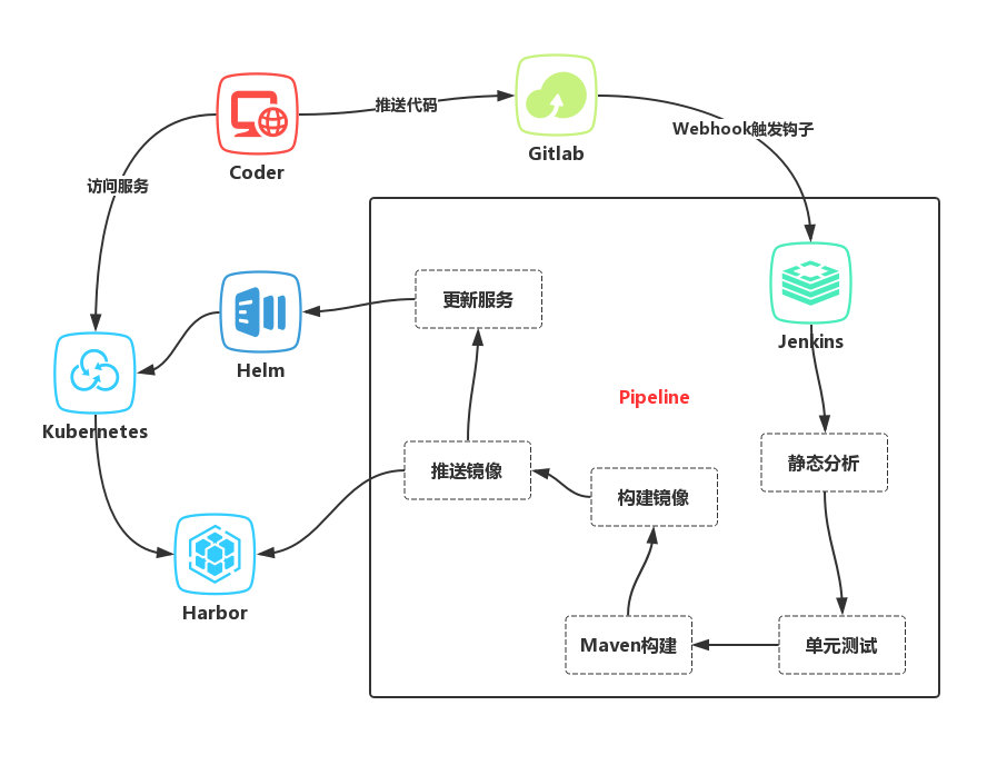 Clone 代码 -> 代码静态分析 -> 单元测试 -> Maven 打包 -> Docker 镜像构建/推送 -> Helm 更新服务。