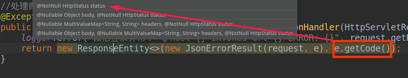 然后这一步就出现了问题,使用ResponseEntity返回异常信息时,第二个参数需要传入HttpStatus,如图: