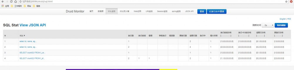 查询完毕之后,我们再来看Druid 的监控界面。在浏览器输入:http://127.0.0.1:8084/druid/index.html