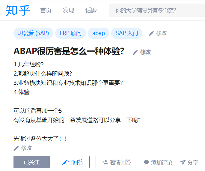 我没有把自己定位成“ABAP开发人员”或是“Java开发人员”,而是“SAP应用开发人员”。也就是说组织给我分配一个开发任务,我自己就得去琢磨,选择合适的编程语言来完成。