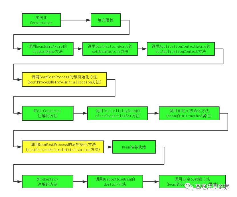 在这里想要强调的是,什么时机从 Spring 中索取 Bean 最合适。之前踩过的一个坑:在 B 的构造函数中获取想要类 A 的 Bean,出现了 NPE(null pointer exception) 。从 Spring 管理 Bean 生命周期的那张图可以看出,Spring 先执行所有类的构造函数来实例化所有 Bean。如果你在类 B 的构造函数中获取类 A 的 Bean,这个时候类 A 的对象极大可能还没实例化呢,所以出现 NPE,而在实例化之后的流程中获取 A 类 Bean 就不会有这个问题。比如继承InitialzationBean,在 afterPropertiesSet() 中获取 A 的 Bean 即可。