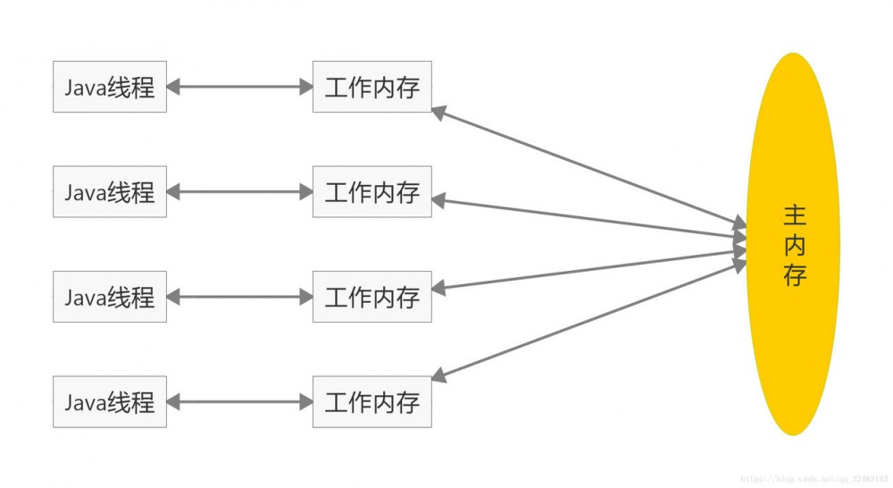 Java程序的所有变量都存储在主内存中。我们知道,Java的每个线程在运行的时候,都会有自己的工作内存,线程所用的变量和数据都是用工作内存中的,工作内存的数据都是从主存中获取的。由于每个线程都是独立的,所以不同线程不可以相互访问工作内存的变量,只有通过主存还传递变量,当线程对数据进行操作之后,会把工作内存的数据刷新到主存,但是这个刷新的时间是不确定的。