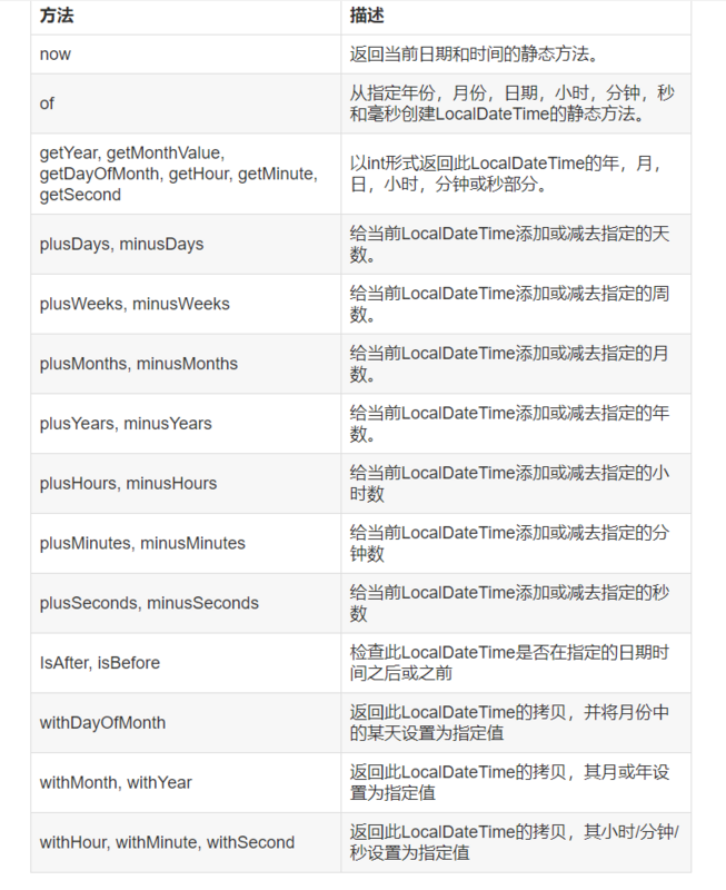 LocalDateTime ldt = LocalDateTime.now(); // 获取系统当前时间 System.out.println(ldt); LocalDateTime ldt2 = LocalDateTime.of(2019, 01, 01, 12, 12, 12, 888000000); // 构建LocalDateTime对象ldt System.out.println(ldt2); // 获取明年此时的时间 LocalDateTime ldt3 = ldt.plusYears(1); System.out.println(ldt3); // 获取去年此刻时间 LocalDateTime ldt4 = ldt.minusYears(1); System.out.println(ldt4); // 获取年 System.out.println(ldt.getYear()); // 获取月份 System.out.println(ldt.getMonthValue()); // 获取本月第某天 System.out.println(ldt.getDayOfMonth()); // 获取时 System.out.println(ldt.getHour()); // 获取分 System.out.println(ldt.getMinute()); // 获取秒 System.out.println(ldt.getSecond()); // 获取纳秒 System.out.println(ldt.getNano());