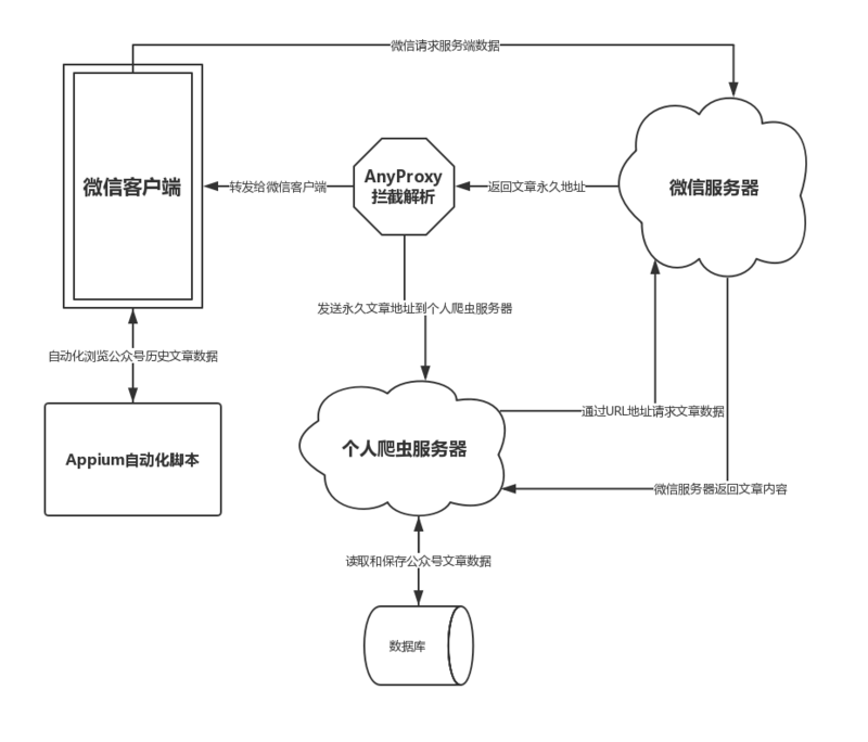 一个是移动端的公众号文章自动浏览实现,逐个访问浏览公众号的历史文章,在浏览公众号文章的时候会请求公众号的文章链接地址,通过AnyProxy中间人代理解析工具,可以获取到永久的文章地址链接。在获取到真实的文章地址链接之后,就可以转发到自己搭建的服务器,逐个保存这些公众号文章的链接地址。