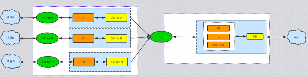 容器和服务发现始终只是在对内部的通信实现,如何将这些服务快速方便的对外实现通信,并且能够高度自动化呢?我们通过将 HA 作为各类后端服务的对外统一入口;配置 backend 服务时,配置的是 Consul 中的服务域名。从而作为内部和外部通信的一个通信转发枢纽。