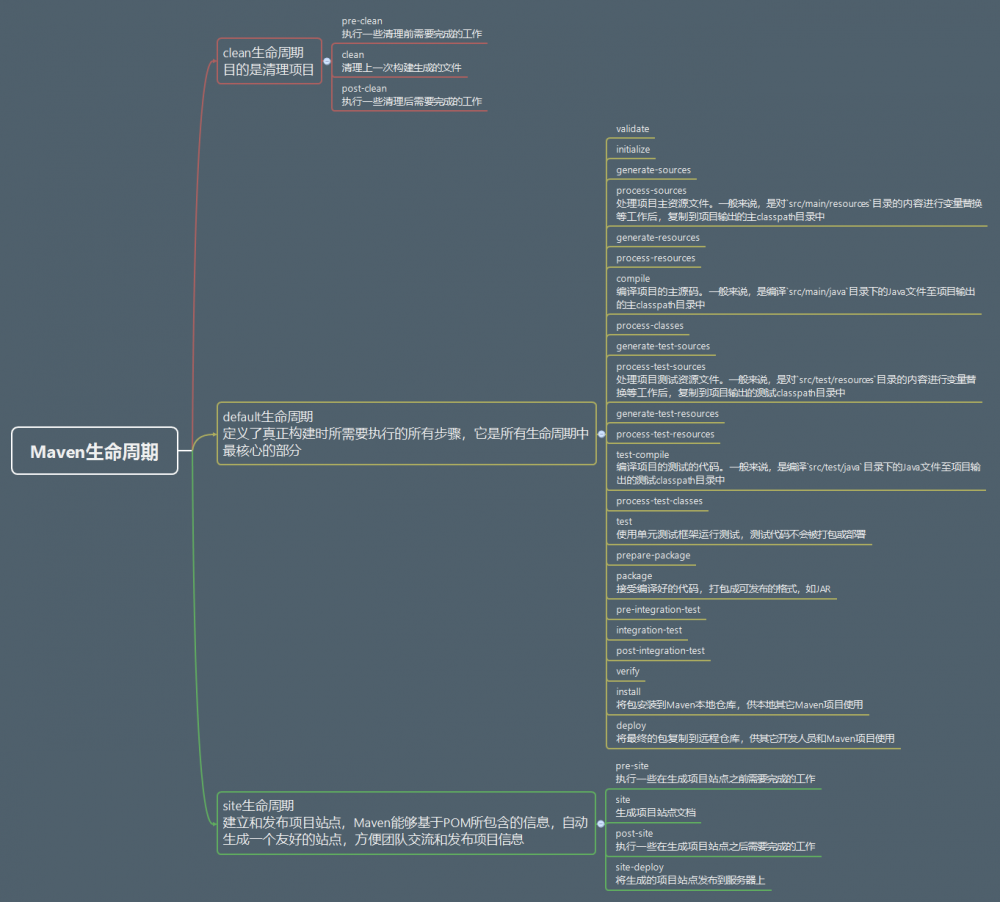 Maven生命周期就是为了对所有的构建过程进行抽象和统一,开发了一套高度完善的、易扩展的生命周期。这个生命周期包含了项目的清理、初始化、编译、测试、打包、集成测试、验证、部署和站点生成等几乎所有构建步骤。换句话说,几乎所有项目的构建,都能映射到这样一个生命周期上。