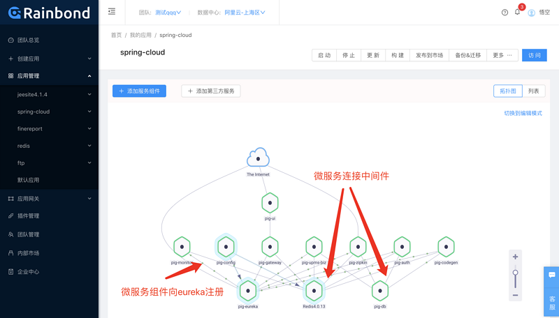 一套完整的 Spring Cloud 微服务体系中,必然会采用多种数据中间件。以 PIG 为例,搭配使用 MySQL 作为数据存储、 REDIS 作为缓存。而在 Spring Cloud 中,这类中间件的对接方式也是通过配置文件配置的。并不会在微服务框架中有其它的注册机制。那么同理可以由 Rainbond 的依赖关系来将微服务与服务中间件连接起来。