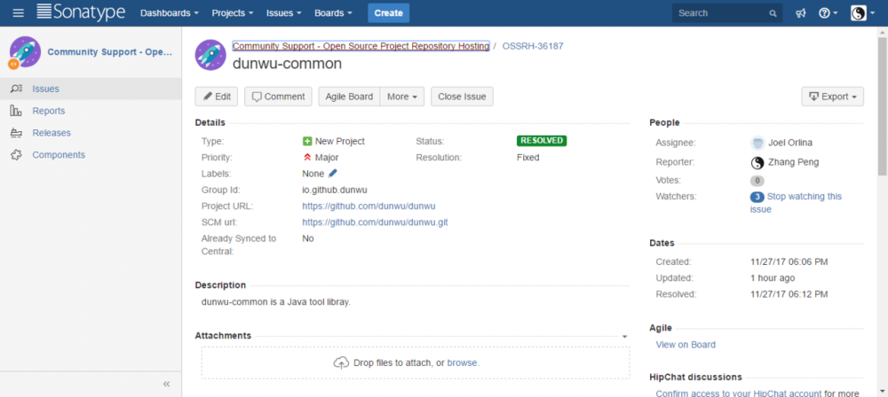 创建完之后需要等待 Sonatype 的工作人员审核处理,审核时间还是很快的,我的审核差不多等待了两小时。当 Issue 的 Status 变为 RESOLVED 后,就可以进行下一步操作了。