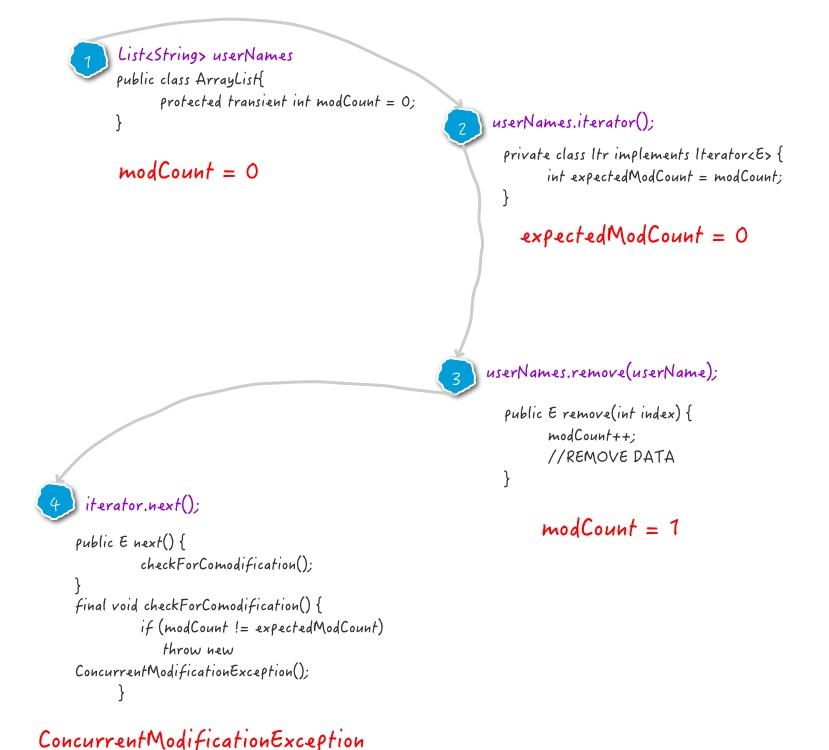 Exception in thread "main" java.util.ConcurrentModificationException at java.util.ArrayList$Itr.checkForComodification(ArrayList.java:909) at java.util.ArrayList$Itr.next(ArrayList.java:859) at com.hollis.ForEach.main(ForEach.java:22) 复制代码