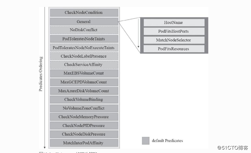 执行预选操作时,调度器将对每个节点基于配置使用的预选策略以特定次序逐一选择,并根据一票否决机制进行淘汰,若预选过后不存在任何一个满足条件的节点,则POD被置于pending状态,直到至少有一个几点可用为止。