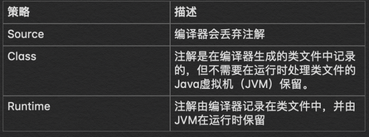 创建注解需要两条信息:(1)retention策略和(2)target。 保留策略(retention) 指定了在程序的生命周期注解应该被保留多长时间。例如,注解可以在编译时或运行时期间保留,具体取决于与注解关联的保留策略。从Java 9开始,有 三种标准保留策略 ,总结如下: