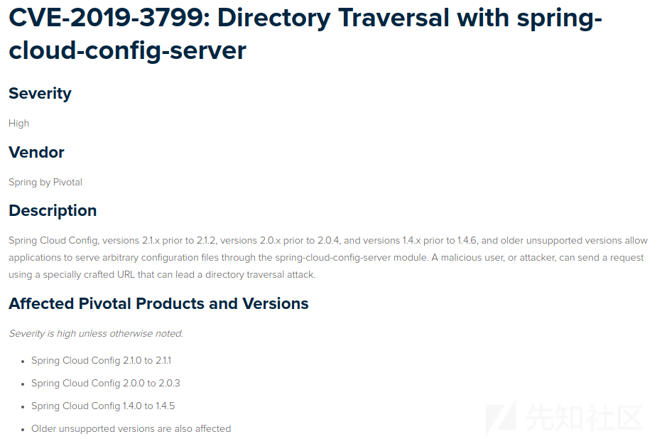 Spring Cloud Config是Spirng Cloud下用于分布式配置管理的组件,分为 Config-Server 和 Config-Client 两个角色。 Config-Server 负责集中存储/管理配置文件, Config-Client 则可以从 Config-Server 提供的HTTP接口获取配置文件使用。2019年4月16日,Pivotal官方发布安全通告,Spring Cloud Config Server 部分版本存在目录遍历漏洞,据此可以获取Server端服务器文件。