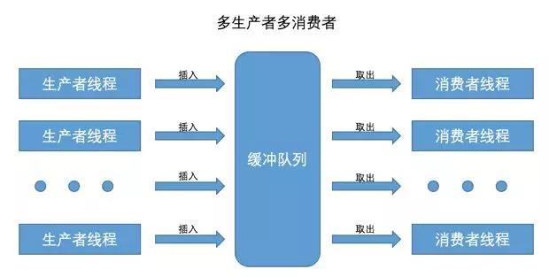 目光从厕所转到饭馆,一个饭馆里通常都有好多厨师以及好多服务员,这里我们把厨师称为 生产者 ,把服务员称为 消费者 ,厨师和服务员是不直接打交道的,而是在厨师做好菜之后放到窗口,服务员从窗口直接把菜端走给客人就好了,这样会极大的提升工作效率,因为省去了生产者和消费者之间的沟通成本。从java的角度看这个事情,每一个厨师就相当于一个 生产者线程 ,每一个服务员都相当于一个 消费者线程 ,而放菜的窗口就相当于一个 缓冲队列 , 生产者线程不断把生产好的东西放到缓冲队列里,消费者线程不断从缓冲队列里取东西 ,画个图就像是这样: