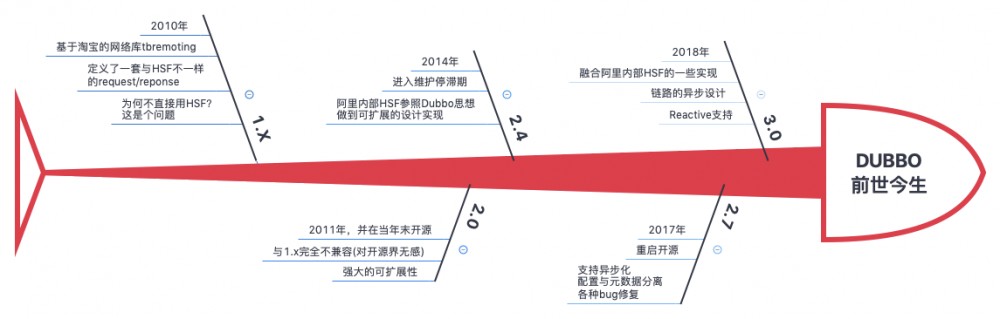 笔者曾做过 Dubbo 协议的适配兼容,Dubbo 确实存在过 1.x 版本,而且从协议设计和模型设计上都与 2.0 的开源版本协议是完全不一样的。下图是关于 Dubbo 的发展路径: