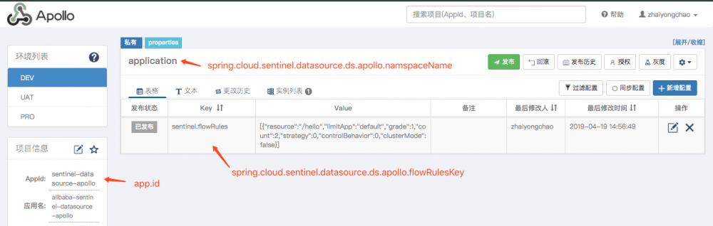 app.id :Apollo中的创建的项目名称,这里采用 spring.application.name 参数的引用,从而达到服务名与配置项目名一致的效果 spring.cloud.sentinel.transport.dashboard :sentinel dashboard的访问地址,根据上面准备工作中启动的实例配置 spring.cloud.sentinel.datasource.ds.apollo.namespaceName :Apollo的空间名 spring.cloud.sentinel.datasource.ds.apollo.flowRulesKey :配置规则的key名称 关于Apollo相关配置的对应关系可见下图所示: