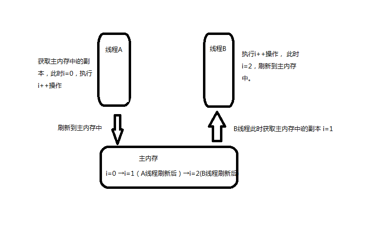 线程之间变量相互可见。假设有一个全局变量i的值为0,同时有线程A和线程B对一个全局变量i执行++操作那么在JMM(JAVA内存模型)中由A线程获取全局变量i的值后在线程内存中对i执行++操作(由于线程互相之间不可见此时对B线程来说i还是0),此时B线程同时进行与A线程一样的操作,在最后刷新到主内存中那么i的值就为1而不是2。这就是线程之间互相不可见造成的线程不安全。