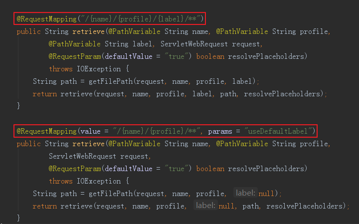 @RequestMapping(value = "/{name}/{profile}/**", params = "useDefaultLabel")