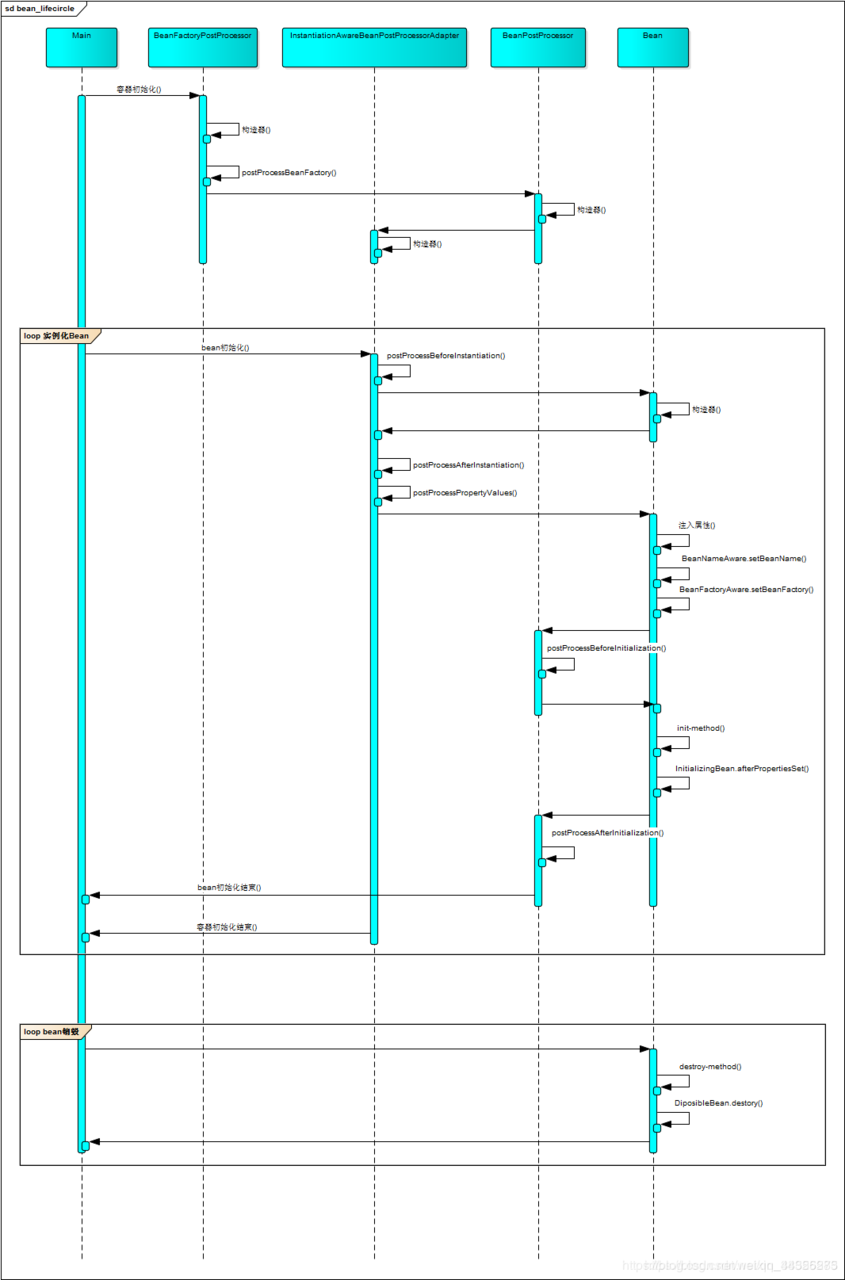 Spring容器开始加载.... 三月 04, 2019 11:14:38 下午 org.springframework.context.support.ClassPathXmlApplicationContext prepareRefresh 信息: Refreshing org.springframework.context.support.ClassPathXmlApplicationContext@707f7052: startup date [Mon Mar 04 23:14:38 CST 2019]; root of context hierarchy 三月 04, 2019 11:14:39 下午 org.springframework.beans.factory.xml.XmlBeanDefinitionReader loadBeanDefinitions 信息: Loading XML bean definitions from class path resource [applicationContext.xml] ****** BeanFactoryPostProcessor 开始执行了 ******* BeanFactoryPostProcessor 执行结束了 【--InstantiationAwareBeanPostProcessor----】postProcessBeforeInstantiation 构造方法被执行了...User 被实例化 【--InstantiationAwareBeanPostProcessor----】postProcessAfterInstantiation 【--InstantiationAwareBeanPostProcessor----】postProcessPropertyValues---> 《注入属性》注入name属性波波烤鸭 【BeanNameWare接口】setBeanName 【BeanFactoryAware接口】setBeanFactory >>后置处理器 before方法:User [id=0, name=波波烤鸭, beanName=user] user 【---InstantiationAwareBeanPostProcessor---】 postProcessBeforeInitialization 初始化:【@PostConstruct】执行了... 初始化:《InitializingBean接口》afterPropertiesSet.... 初始化:【init-method】方法执行了.... <<后置处理器after方法:User [id=0, name=波波烤鸭, beanName=user] user 【--InstantiationAwareBeanPostProcessor----】 postProcessAfterInitialization ---------------User [id=0, name=波波烤鸭, beanName=user] Spring容器卸载完成.... 三月 04, 2019 11:14:39 下午 org.springframework.context.support.ClassPathXmlApplicationContext doClose 信息: Closing org.springframework.context.support.ClassPathXmlApplicationContext@707f7052: startup date [Mon Mar 04 23:14:38 CST 2019]; root of context hierarchy 【@preDestory】执行了... 《DisposableBean接口》destroy .... 【destory-method】方法执行了.... 复制代码