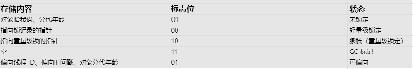 并且Mark Word 被设计为 没有固定的数据结构 用来在很小的空间内可以存储更多的信息,它会根据不同的状态存储不同的数据。例如在32位情况下,存储内容的变化如下