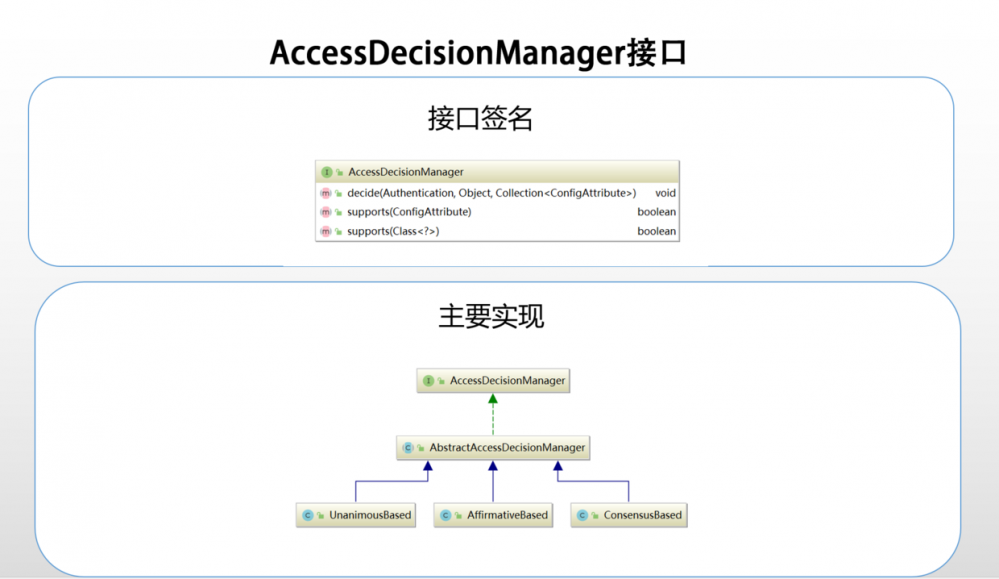在详细介绍三种 AccessDecisionManager 的实现类前,我们先再来梳理下 AccessDecisionManager 与 AccessDecisionVoter 的在决策框架中的关系。 在框架设计中 AccessDecisionManager 是 AccessDecisionVoter 的集合类,管理着对于不同规则进行判断与表决的 AccessDecisionVoter 们。 但不同的是, AccessDecisionVoter 分别都只会对自己支持的规则进行表决,如一个资源的访问规则存在多个并行时,便不能以某一个 AccessDecisionVoter 的表决作为最终的访问授权结果。 AccessDecisionManager 的职责便是在这种场景下,汇总所有 AccessDecisionVoter 的表决结果后给出一个最终的决策。从而导致框架中预设了三种不同决策规则的 AccessDecisionManager 的实现类。