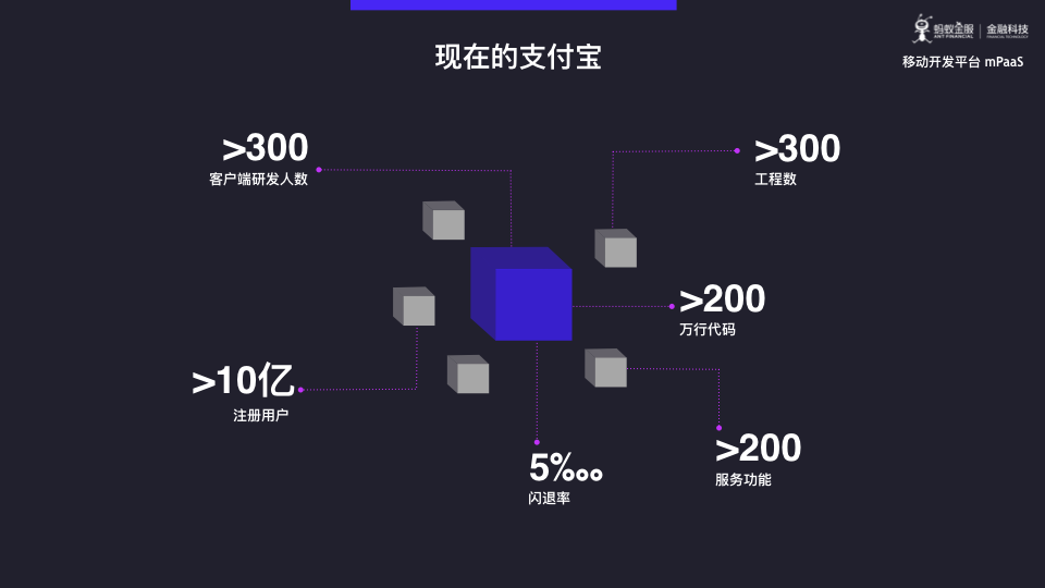 在研发上面,支付宝的客户端研发人员超过 300+,整体工程数同样也是超过 300+,总体代码超过 200 万行,提供的服务超过 200+,并且整体的闪退率维持万分之五以下,那么支付宝是如何保证在如此庞大的研发规模下,保证服务的告诉迭代,以及应用的整体稳定性的呢?