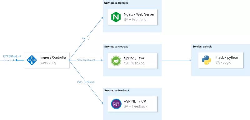 $ kubectl apply -f resource-manifests/kube persistentvolumeclaim/sqlite-pvc created deployment.extensions/sa-feedback created service/sa-feedback created deployment.extensions/sa-frontend created service/sa-frontend created deployment.extensions/sa-logic created service/sa-logic created deployment.extensions/sa-web-appcreated service/sa-web-appcreated