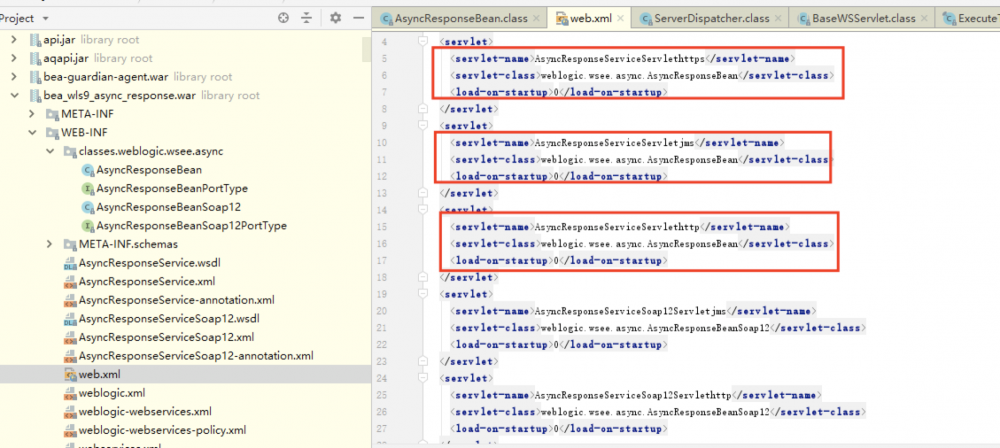 首先先看一下 bea_wls9_async_response.war!/WEB-INF/web.xml 内容,我们发现这里的所有请求都是交给 weblogic.wsee.async.AsyncResponseBean 方法继续处理。