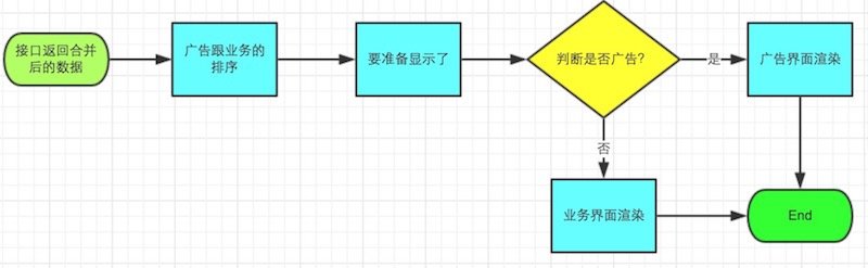 那么如何解决这个问题呢?如何使用一种不侵入业务的方式优雅的去解决这个问题呢?答案就是使用AOP,让正常的业务和广告并行独立滴处理,下图就是使用AOP方式处理数据流中接入广告流程图