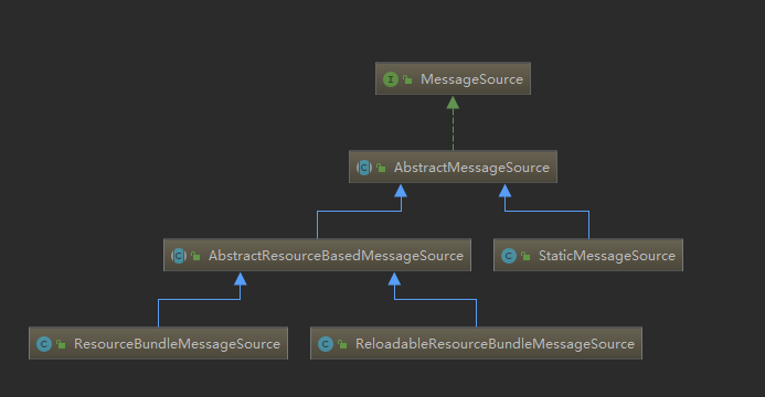 从类图结构中可以看出,顶层接口 MessageSource 下面有个抽象类 AbstractMessageSource ,三个基本实现类 ResourceBundleMessageSource , ReloadableResourceBundleMessageSource , StaticMessageSource 。