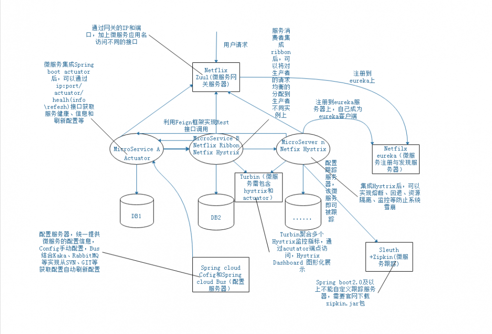 Sleuth+ZipKin(跟踪服务):Sleuth和Zipkin结合使用可以通过图形化的界面查看微服务请求的延迟情况以及各个微服务的依赖情况。需要注意的是Spring Boot 2及以上不在支持Zipkin的自定义,需要到官方网站下载ZipKin相关的jar包。另外需要提一点的是Spring Boot Actuator,提供了很多监控端点如/actuator/info、/actuator/health、/acutator/refresh等,可以查看微服务的信息、健康状况、刷新配置等。