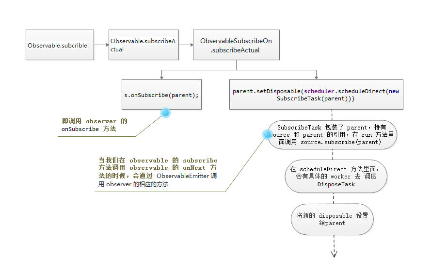 简单来说就是,当我们调用 Observable 的 subsribe 方法的时候,会调用当前对应 observbale 的 subscribeActual 方法,在该方法里面,会调用 observer 的 onSubeciber 方法,并调用对应 ObservableOnSubscirbe 的 subcribe 的方法,并将 ObservableEmitter 作为方法参数暴露出去。而 ObservableEmitter 持有我们的 Observer 的引用,当我们调用 ObservableEmitter 的 onNext,onErrot,onComplete 方法的时候,会调用他持有的 Observer 的相应的方法。