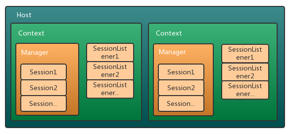 tomcat session 组件图如下所示,其中 Context 对应一个 webapp 应用,每个 webapp 有多个 HttpSessionListener , 并且每个应用的 session 是独立管理的,而 session 的创建、销毁由 Manager 组件完成,它内部维护了 N 个 Session 实例对象。在前面的文章中,我们分析了 Context 组件,它的默认实现是 StandardContext ,它与 Manager 是一对一的关系, Manager 创建、销毁会话时,需要借助 StandardContext 获取 HttpSessionListener 列表并进行事件通知,而 StandardContext 的后台线程会对 Manager 进行过期` Session 的清理工作