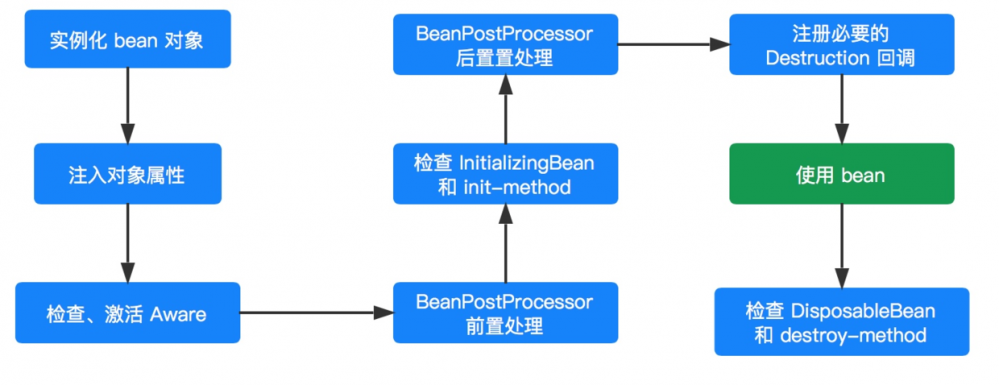 原来我们采用 new 的方式创建一个对象,用完该对象在其脱离作用域后就会被回收,对于后续操作我们无权也没法干涉,但是采用 Spring 容器后,我们完全摆脱了这种命运,Spring 容器将会对其所有管理的 Bean 对象全部给予一个统一的生命周期管理,同时在这个阶段我们也可以对其进行干涉(比如对 bean 进行增强处理,对 bean 进行篡改),如上图。