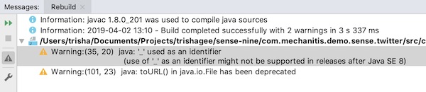 . -> /Library/Java/JavaVirtualMachines/jdk1.8.0_201.jdk/Contents/Home/jre/lib/rt.jar com.mechanitis.demo.sense.twitter.connector.TwitterOAuth(.) -> sun.misc.BASE64EncoderJDK internal API (rt.jar) -> sun.misc.UnsafeJDK internal API (rt.jar) Warning: JDK internal APIs are unsupported and private to JDK implementation that are subject to be removed or changed incompatibly and could break your application. Please modify yourcodeto eliminate dependency on any JDK internal APIs. For the most recent update on JDK internal API replacements, please check: https://wiki.openjdk.java.net/display/JDK8/Java+Dependency+Analysis+Tool JDK Internal API Suggested Replacement ---------------- --------------------- sun.misc.BASE64EncoderUse java.util.Base64@since1.8 sun.misc.UnsafeSee http://openjdk.java.net/jeps/260