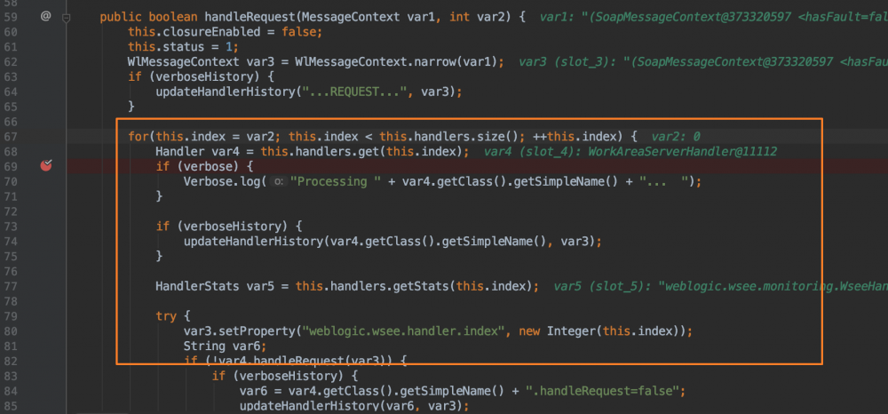 在HandlerIterator中调用handleRequest函数时,有一个for循环来遍历hanlders,如图所示: