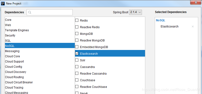 新建一个 spring boot 项目,在 NoSql 这一栏选中 Elasticsearch 。