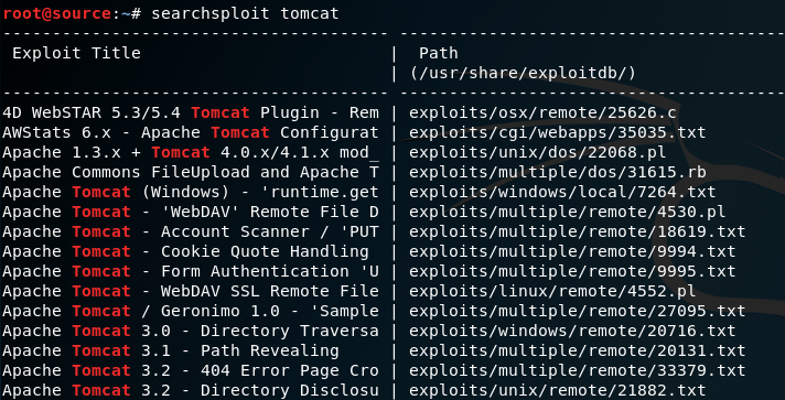 exploit-db.com这个网站适合找漏洞,进行漏洞利用。只需要搜索版本信息,就可以出来很多的已知漏洞。可以说,这就是一个漏洞库。另外,kali中也可以找出大量的漏洞利用代码,就是用searchsploit tomcat类似的命令,就可以搜到tomcat的各种漏洞利用代码: